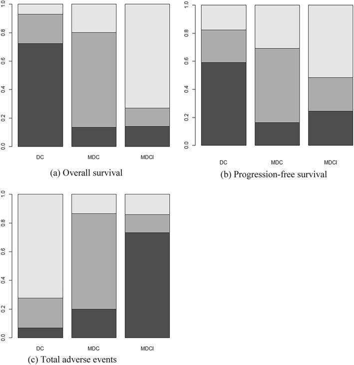 Results: The network meta-analysis results revealed that MDCI had a significant lower hazard risk of overall survival [MDCI vs MDC: HR = 0.74, 95% CrI (0.23, 0.87); MDCI vs DC: HR = 0.60, 95% CrI (0.16, 0.92)]. In addition, MDCI had a clearly longer progression-free survival time than that of DC [MDCI: HR = 0.88, 95% CrI (0.46, 0.98)]. No significant difference was detected in MDC and DC in OS, PFS, and AEs. The probabilities of rank plot showed that MDCI ranked first in OS (73.12%) and PFS (52.43%). DC was the best treatment in safety, ranked first (75.43%).