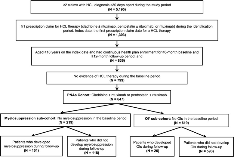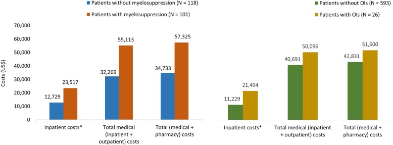 Results: In total, 647 PNA-treated patients were identified (mean age: 57.1 years). Myelosuppression and OI incidence were 461 and 42 per 1000 patient-years, respectively. Adjusted results indicated that those with myelosuppression had higher rates of hospitalization (47.4% vs 12.4%; P < .0001) and incurred higher mean inpatient costs ($23,517 vs $12,729; P = .011) and total costs ($57,325 vs $34,733; P = .001) as compared with those without myelosuppression. Similarly, patients with OIs had higher rates of hospitalization (53.8% vs 30.8%; P = .025) and incurred higher mean inpatient costs ($21,494 vs $11,229; P < .0001) as compared with those without OIs.