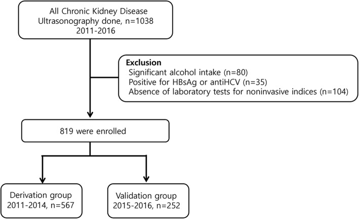 Methods: This retrospective cross-sectional study was conducted in a single tertiary center. We enrolled 819 CKD patients and evaluated the predictive performance of relevant clinical and laboratory markers for the presence of NAFLD in both derivation (data from 2011 to 2014, n = 567) and validation (data from 2015 to 2016, n = 252) groups.
