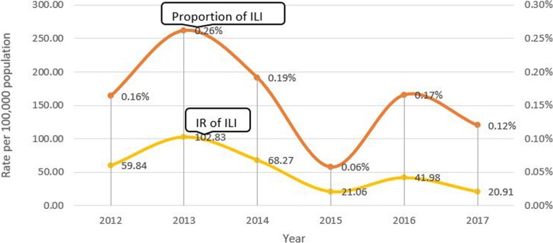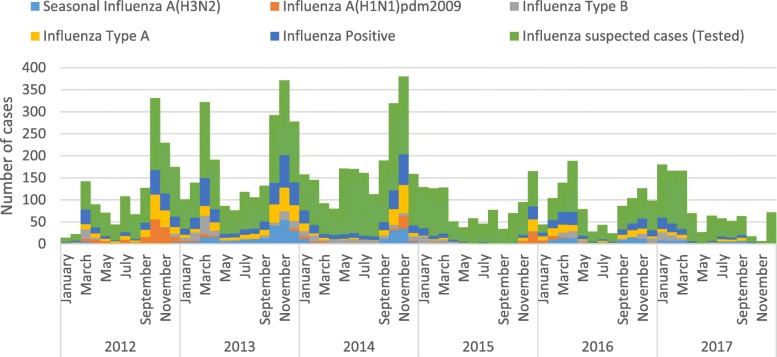 Method: Influenza sentinel surveillance data collected from 3 influenza like illness (ILI) and 5 Severe Acute Respiratory Illness (SARI) sites from 2012 to 2017 was used for analysis. Descriptive statistics were applied for simple analysis. The proportion of medically attended influenza positive cases and incidence rate of ILI was determined using total admitted patients and catchment area population. Seasonality was estimated based on weekly trend of ILI and predicted threshold was done by applying the "Moving Epidemic Method (MEM)".