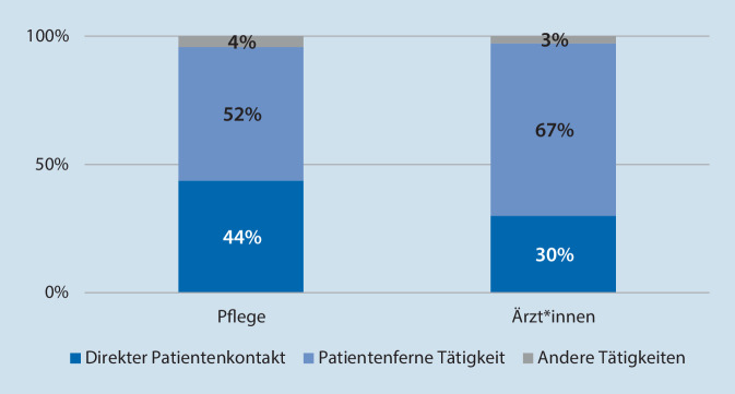Material und methoden: Tätigkeitsanalysen auf Basis teilnehmender Beobachtungen (je 90 min) bei Pflegekräften und Ärzt*innen einer interdisziplinären Notaufnahme eines süddeutschen Krankenhauses der Maximalversorgung. Beobachtete Tätigkeiten wurden anhand eines Klassifikationssystems mitsamt Zeitdauern kodiert. Insgesamt wurden 160 Einzelbeobachtungen (mit einer Gesamtzeit von ca. 240 h) durchgeführt; 99 bei Pflegekräften sowie 61 bei Ärzt*innen.