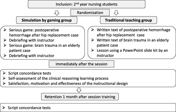 Background: Early detection and response to patient deterioration influence patient prognosis. Nursing education is therefore essential. The objective of this randomized controlled trial was to compare the respective educational value of simulation by gaming (SG) and a traditional teaching (TT) method to improve clinical reasoning (CR) skills necessary to detect patient deterioration.