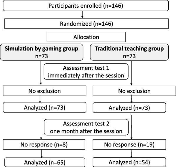 Results: One hundred forty-six students were randomized. Immediately after training, the SCTs scores were 59 ± 9 in SG group (n = 73) and 58 ± 8 in TT group (n = 73) (p = 0.43). One month later, the SCTs scores were 59 ± 10 in SG group (n = 65) and 58 ± 8 in TT group (n = 54) (p = 0.77). Global satisfaction and motivation were highly valued in both groups although significantly greater in the SG group (p < 0.05). The students declared that the training course would have a positive professional impact, with no difference between groups.