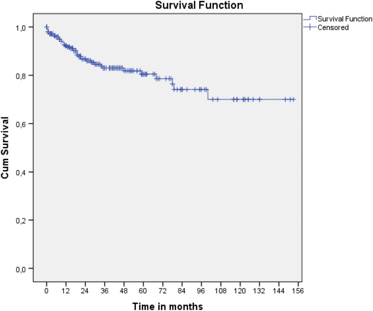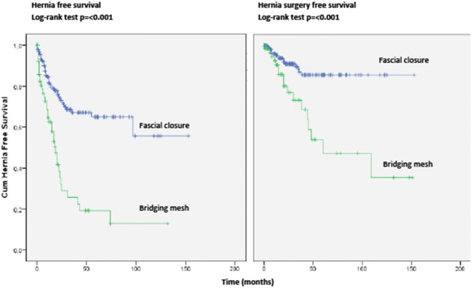 Results: In long-term analysis, 266 modified VHWG grade 3 procedures were included. The overall HR rate was 32.3%. The HR rates for non-crosslinked biologic meshes and synthetic meshes when fascial closure was achieved were 20.3% and 30.6%, respectively. The rates of FHS were 7.2% and 16.7%, and occurred only within the first 3 years. Bridged repairs showed poorer results (fascial closure 22.9% hernia recurrence vs bridged 57.1% recurrence). Overall survival was relatively good with 80% en 70% of the patients still alive after 5 and 10 years, respectively. In total 86.6% of the patients remained free of FHS.