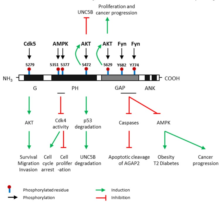 AGAP2 (Arf GAP with GTP-binding protein-like domain, Ankyrin repeat and PH domain 2) isoform 2 is a protein that belongs to the Arf GAP (GTPase activating protein) protein family. These proteins act as GTPase switches for Arfs, which are Ras superfamily members, being therefore involved in signaling regulation. Arf GAP proteins have been shown to participate in several cellular functions including membrane trafficking and actin cytoskeleton remodeling. AGAP2 is a multi-tasking Arf GAP that also presents GTPase activity and is involved in several signaling pathways related with apoptosis, cell survival, migration, and receptor trafficking. The increase of AGAP2 levels is associated with pathologies as cancer and fibrosis. Transforming growth factor beta-1 (TGF-β1) is the most potent pro-fibrotic cytokine identified to date, currently accepted as the principal mediator of the fibrotic response in liver, lung, and kidney. Recent literature has described that the expression of AGAP2 modulates some of the pro-fibrotic effects described for TGF-β1 in the liver. The present review is focused on the interrelated molecular effects between AGAP2 and TGFβ1 expression, presenting AGAP2 as a new player in the signaling of this pro-fibrotic cytokine, thereby contributing to the progression of hepatic fibrosis.