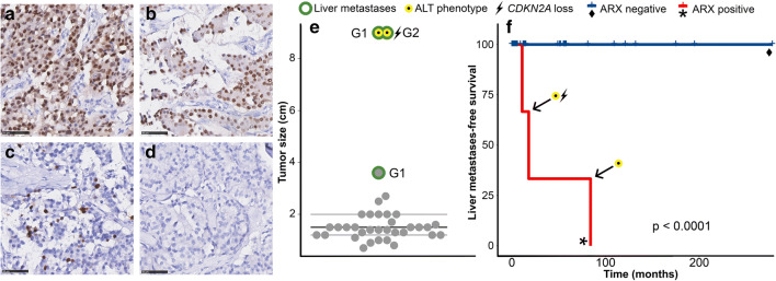 Insulin-producing pancreatic neuroendocrine tumors (PanNETs)/insulinomas are generally considered to be indolent tumors with an excellent prognosis after complete resection. However, some insulinomas have a poor prognosis due to relapses and metastatic disease. Recently, studies in non-functional PanNETs indicated that behavior can be stratified according to alpha- and beta-cell differentiation, as defined by expression of the transcription factors ARX and PDX1, respectively. It is unknown whether similar mechanisms play a role in insulinomas. Therefore, we determined ARX and PDX1 expression in a cohort of 35 sporadic primary insulinomas and two liver metastases of inoperable primary insulinomas. In addition, WHO grade and loss of ATRX or DAXX were determined by immunohistochemistry, and alternative lengthening of telomeres (ALT) and CDKN2A status by fluorescence in situ hybridization. These findings were correlated with tumor characteristics and clinical follow-up data. In total, five out of 37 insulinoma patients developed metastatic disease. Metastatic insulinomas were all larger than 3 cm, whereas the indolent insulinomas were smaller (p value < 0.05). All three primary insulinomas that metastasized showed ARX expression, 2/3 showed ALT, and 1/3 had a homozygous deletion of CDKN2A as opposed to absence of ARX expression, ALT, or CDKN2A deletions in the 32 non-metastatic cases. The two liver metastases also showed ARX expression and ALT (2/2). The presence of ARX expression, which is usually absent in beta-cells, and genetic alterations not seen in indolent insulinomas strongly suggest a distinct tumorigenic mechanism in malignant insulinomas, with similarities to non-functional PanNETs. These observations may inform future follow-up strategies after insulinoma surgery.
