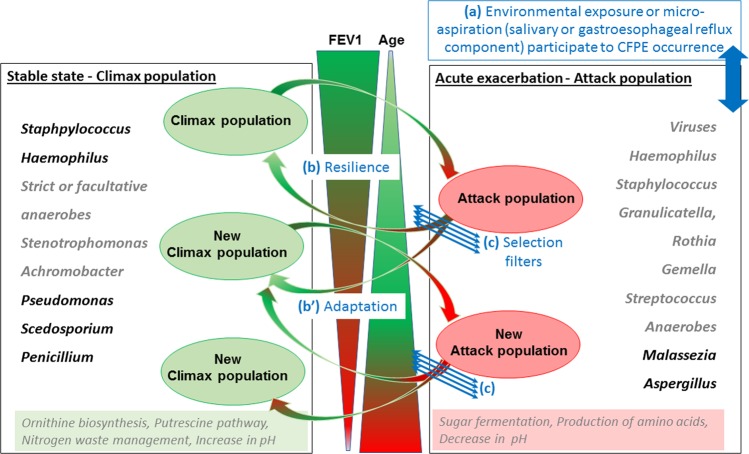 Lung infections play a critical role in cystic fibrosis (CF) pathogenesis. CF respiratory tract is now considered to be a polymicrobial niche and advances in high-throughput sequencing allowed to analyze its microbiota and mycobiota. However, no NGS studies until now have characterized both communities during CF pulmonary exacerbation (CFPE). Thirty-three sputa isolated from patients with and without CFPE were used for metagenomic high-throughput sequencing targeting 16S and ITS2 regions of bacterial and fungal rRNA. We built inter-kingdom network and adapted Phy-Lasso method to highlight correlations in compositional data. The decline in respiratory function was associated with a decrease in bacterial diversity. The inter-kingdom network revealed three main clusters organized around Aspergillus, Candida, and Scedosporium genera. Using Phy-Lasso method, we identified Aspergillus and Malassezia as relevantly associated with CFPE, and Scedosporium plus Pseudomonas with a decline in lung function. We corroborated in vitro the cross-domain interactions between Aspergillus and Streptococcus predicted by the correlation network. For the first time, we included documented mycobiome data into a version of the ecological Climax/Attack model that opens new lines of thoughts about the physiopathology of CF lung disease and future perspectives to improve its therapeutic management.