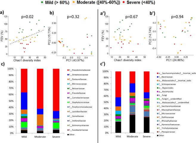 ) alteration of the lung function measured by FEV1. Dataset from each sputum sample contained an average of 7,909 bacterial reads (ranging from 5,104 to 14,749), and an average of 9,811 fungal reads (ranging from 2,933 to 15,599). Alpha diversity indexes of the bacterial microbiome (a) but not of mycobiome (a′) were positively correlated with FEV1 values. When patients were divided into 3 groups according to FEV1 values,, bi-dimensional PCoA representations (b,b′) based on Bray-Curtis similarity matrix did not show clustering between groups. However, we observed a high proportion (62% and 66%) of Pseudomonadaceae (mainly composed of Pseudomonas species) among patients exhibiting a moderate and severe disease, while it represents only 32% of the bacterial composition among patients with a mild ventilatory deficit (c). The fungal composition exhibited also some shifts, especially a decrease in OTUs belonging to Malasseziales in samples from patients with severe lung decline (c′). Taxonomy composition were represented at family level of bacterial (c) and fungal (c′) microbiotas; fungal reads that were not identified as family levels are grouped at order or phylum levels.