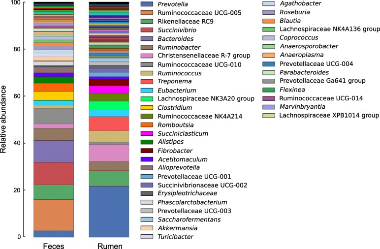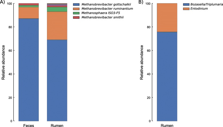 Results: We identified 4265 Amplicon Sequence Variants (ASVs) from bacteria, 571 from archaea, and 107 from protozoa, of which 143 (96 bacteria and 47 archaea) were found common between both microbiomes. The most prominent bacterial phyla identified were Bacteroidetes (41.48%) and Firmicutes (56.86%) in the ruminal and fecal microbiomes, respectively, with Prevotella and Ruminococcaceae UCG-005 the most relatively abundant genera identified in each microbiome. The most abundant archaeal phylum identified was Euryarchaeota, of which Methanobrevibacter gottschalkii, a methanogen, was the prevalent archaeal species identified in both microbiomes. Protozoa were found exclusively identified in the rumen with Bozasella/Triplumaria being the most frequent genus identified. Co-occurrence among ruminal and fecal ASVs reinforces the relationship of microorganisms within a biological niche. Furthermore, the co-occurrence of shared archaeal ASVs between microbiomes indicates a dependency of the predominant fecal methanogen population on the rumen population.