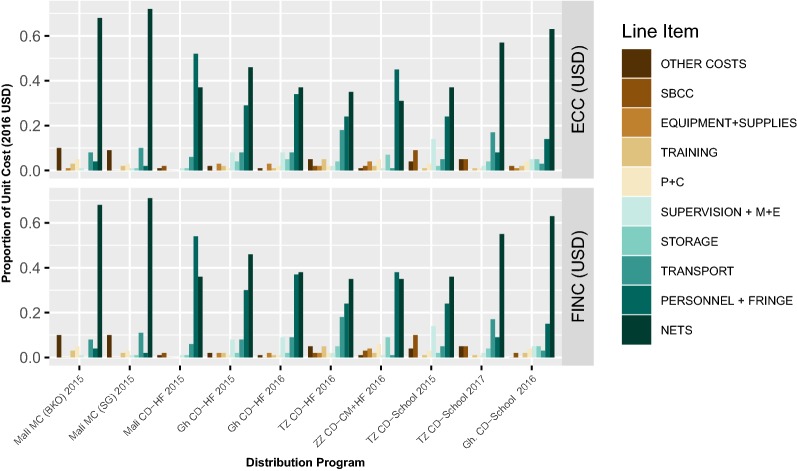 Results: Overall, from a full provider perspective, mass distributions and continuous systems delivered ITNs at overlapping economic costs per net distributed (mass distributions: 4.37-4.61 USD, CD channels: 3.56-9.90 USD), with two of the school-based systems and the mass distributions at the lower end of this range. From the perspective of international donors, the costs of the CD systems were, for the most part, less costly than the mass distributions (mass distributions: 4.34-4.55 USD, Ghana and Tanzania 2017 school-based: 3.30-3.69 USD, health facility-based: 3.90-4.55 USD, combined community/health facility 4.55 USD). The 2015 school-based distribution (7.30 USD) and 2016 health facility-based distribution (6.52 USD) programmes in Tanzania were an exception. Mass distributions were more heavily financed by donors, while CD relied more extensively on domestic resource contributions.