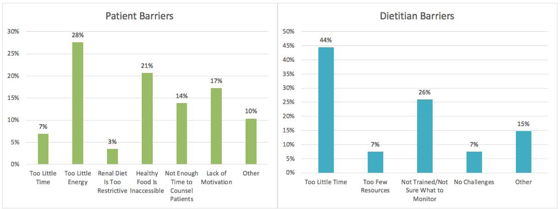 Results: Thirty-one renal dietitians responded to the survey (26% response rate). The majority of respondents (90%) indicated that access to kidney transplantation was the main reason that dialysis patients with obesity desired weight loss. Calorie restriction was rated as the most common weight loss approach, and dry weight as the most important weight loss biomarker. Nearly 40% of respondents do not alter their nutritional approach when dialysis patients with obesity are losing weight, and 42% of respondents do not monitor changes in waist circumference. Exercise, diet counseling, and stress management were variably prioritized as weight loss management strategies. Barriers to obesity management in dialysis settings included lack of time, lack of training in weight loss counseling, and gaps in current renal nutritional guidelines.