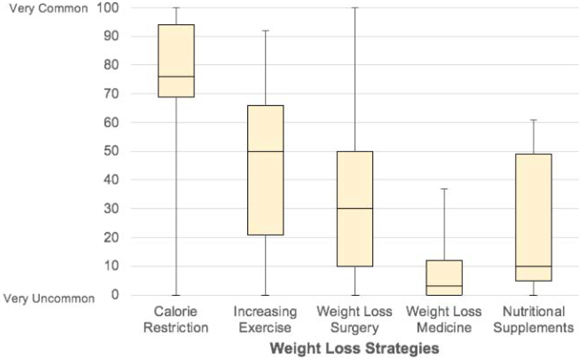 Design and methods: An online 21-item survey was distributed to 118 renal dietitians via individual outreach and a professional organization e-mail listserv. Four themes were explored: the burden of obesity among dialysis patients, concepts of healthy weight loss, weight loss approaches, and challenges of obesity management in dialysis settings. Respondents were asked to rank approaches and biomarkers for obesity management from 0 (least important or not used) to 100 (most important). Free text fields were provided in each category for additional comments.