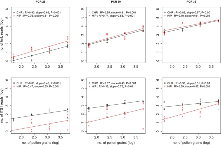 Experimental quantification of pollen with DNA metabarcoding using ITS1 and trnL