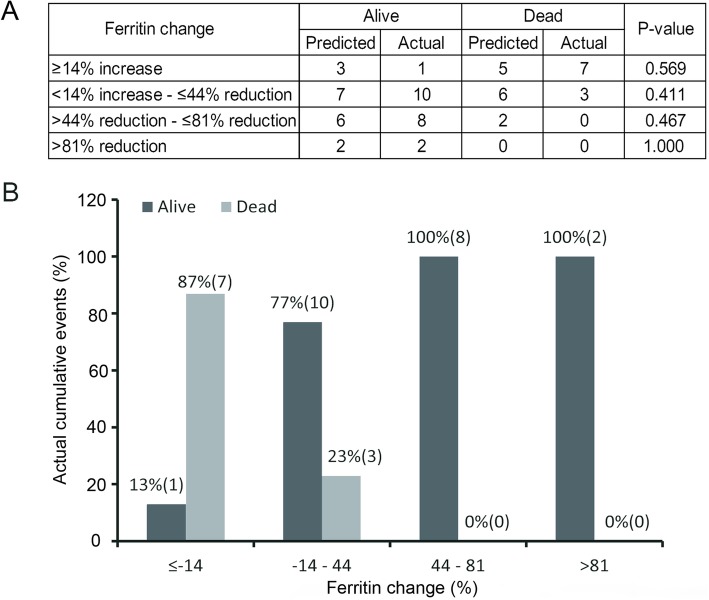 Results: Multivariate analysis revealed that significantly high post-treatment serum ferritin levels (>1050 μg/L) were associated with a higher risk of death and poor overall survival in the test cohort (hazard ratio (HR): 3.176, 95% confidence interval (CI) 1.468-6.869, P = 0.003), and the validation cohort (HR: 13.412, 95%CI 1.716-104.816, P = 0.013). At 6-month follow-up period in the test cohort, patients with a > 81% decrease in the serum ferritin level had a significantly higher probability of survival when compared with the patients with ≥14% increase in the serum ferritin level (94% vs. 31%, P < 0.001). Similar findings were observed on the analysis of the decrease in the serum ferritin level in the validation cohort.