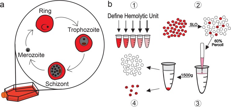 For intracellular pathogens, the host cell provides needed protection and nutrients. A major challenge of intracellular parasite research is collection of high parasite numbers separated from host contamination. This situation is exemplified by the malaria parasite, which spends a substantial part of its life cycle inside erythrocytes as rings, trophozoites, and schizonts, before egress and reinvasion. Erythrocytic Plasmodium parasite forms refractory to enrichment remain understudied due to high host contamination relative to low parasite numbers. Here, we present a method for separating all stages of Plasmodium-infected erythrocytes through lysis and removal of uninfected erythrocytes. The Streptolysin O-Percoll (SLOPE) method is effective on previously inaccessible forms, including circulating rings from malaria-infected patients and artemisinin-induced quiescent parasites. SLOPE can be used on multiple parasite species, under multiple media formulations, and lacks measurable impacts on parasite viability. We demonstrate erythrocyte membrane cholesterol levels modulate the preferential lysis of uninfected host cells by SLO, and therefore modulate the effectiveness of SLOPE. Targeted metabolomics of SLOPE-enriched ring stage samples confirms parasite-derived metabolites are increased and contaminating host material is reduced compared to non-enriched samples. Due to consumption of cholesterol by other intracellular bacteria and protozoa, SLOPE holds potential for improving research on organisms beyond Plasmodium.