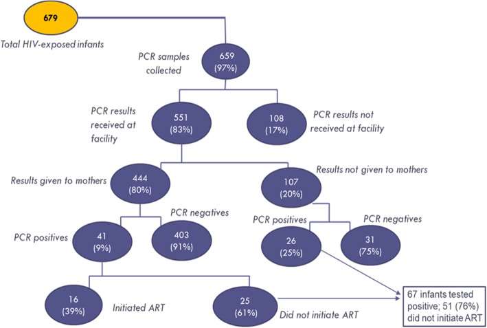 Results: HIV testing and ART initiation coverage for mothers tends to be high, but EID and pediatric ART initiation are hampered by lack of patient tracking, long waiting times, and inadequate counseling to navigate the care cascade. About 76% of HIV-positive infants were LTFU and did not initiate ART.