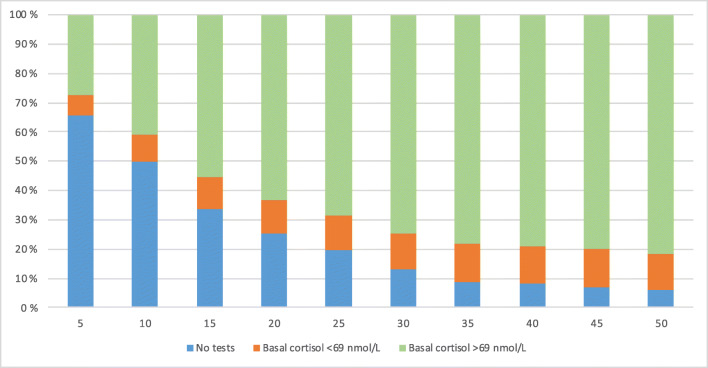 Prednisolone used in the induction phase of the treatment of acute lymphoblastic leukemia (ALL) may suppress hypothalamic-pituitary-adrenal axis and require hydrocortisone substitution. In this retrospective analysis, we reviewed altogether 371 ACTH stimulation tests of 352 children after a uniform NOPHO (Nordic Society of Pediatric Hematology and Oncology) ALL induction. Both low- and standard-dose ACTH tests were used. Full recovery of adrenal function was defined by both normal basal and stimulated cortisol levels. Sixty-two percent of patients were detected with normal adrenal function in median of 15 days after tapering of prednisolone. Both low basal and stimulated cortisol levels were detected in 13% of patients. The median time to normal adrenal function was 31 days (95% CI 28-34), 24 days (95% CI 18-30), and 12 days (95% CI 10-14) for those with basal cortisol <107, 107-183, and >183 nmol/L at first ACTH testing, respectively. Patients with fluconazole prophylaxis had higher median baseline cortisol levels compared to patients without prophylaxis (207 nmol/L, range 21-839 nmol/L vs. 153 nmol/L, range 22-832 nmol/L, P = 0.003).Conclusion: These data can be used to reduce unnecessary substitution or testing, but also to guarantee hydrocortisone substitution for those at risk. What is Known: •These data can be used to reduce unnecessary hydrocortisone substitution or ACTH testing. •Our data helps to guarantee hydrocortisone substitution for those at risk of adrenal insufficiency. What is New: •Full recovery of adrenal function after ALL induction is detected in 62% of patients already at 15 days after tapering of prednisolone. •Both basal and stimulated cortisol testing are required for detection of full adrenal recovery. •Recovery time of adrenal function is extended over 3-4 weeks after tapering of prednisolone in patients with low basal cortisol levels (<107 nmol/L) at first testing.
