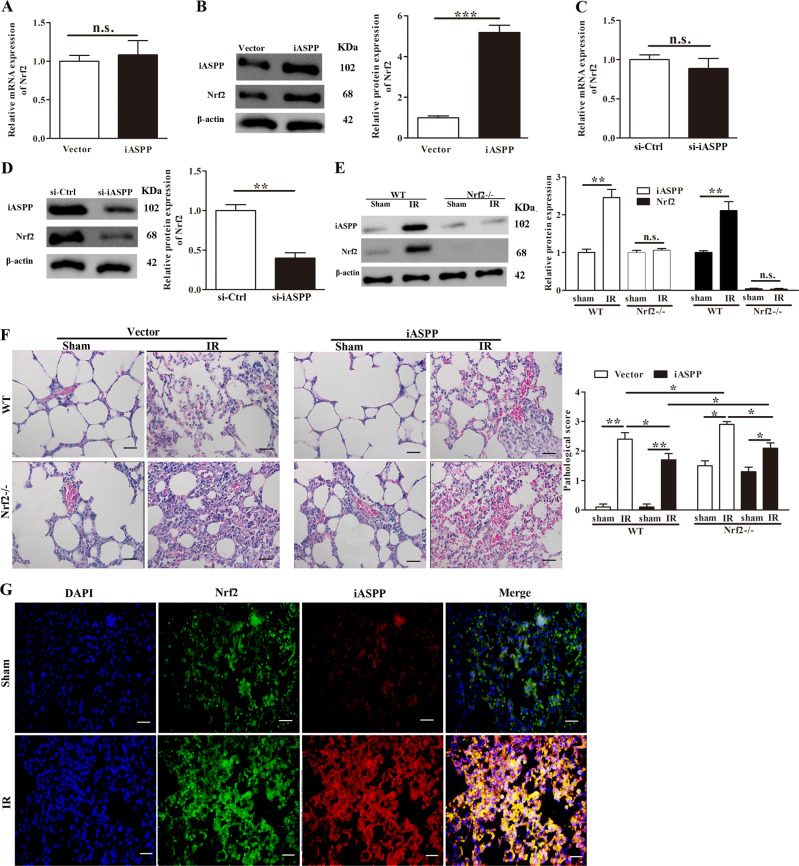 Acute lung injury (ALI) is a life-threatening disorder with high rates of morbidity and mortality. Reactive oxygen species and epithelial apoptosis are involved in the pathogenesis of acute lung injury. Ferroptosis, an iron-dependent non-apoptotic form of cell death, mediates its effects in part by promoting the accumulation of reactive oxygen species. The inhibition of ferroptosis decreases clinical symptoms in experimental models of ischemia/reperfusion-induced renal failure and heart injury. This study investigated the roles of inhibitor of apoptosis-stimulating protein of p53 (iASPP) and Nrf2 in ferroptosis and their potential therapeutic effects in intestinal ischemia/reperfusion-induced acute lung injury. Intestinal ischemia/reperfusion-induced ALI was induced in wild-type and Nrf2-/- mice. The mice were treated with erastin followed by liproxstatin-1. Ferroptosis-related factors in mice with ischemia/reperfusion-induced acute lung injury or in mouse lung epithelial-2 cells with hypoxia/regeneration (HR)-induced ALI were measured by western blotting, real-time PCR, and immunofluorescence. Ferroptosis contributed to intestinal ischemia/reperfusion-induced ALI in vivo. iASPP inhibited ferroptosis and alleviated intestinal ischemia/reperfusion-induced acute lung injury, and iASPP-mediated protection against ischemia/reperfusion-induced ALI was dependent on Nrf2 signaling. HR-induced acute lung injury enhanced ferroptosis in vitro in mouse lung epithelial-2 cells, and ferroptosis was modulated after the enhancement of intestinal ischemia/reperfusion in Nrf2-/- mice. iASPP mediated its protective effects against acute lung injury through the Nrf2/HIF-1/TF signaling pathway. Ferroptosis contributes to intestinal ischemia/reperfusion-induced ALI, and iASPP treatment inhibits ferroptosis in part via Nrf2. These findings indicate the therapeutic potential of iASPP for treating ischemia/reperfusion-induced ALI.
