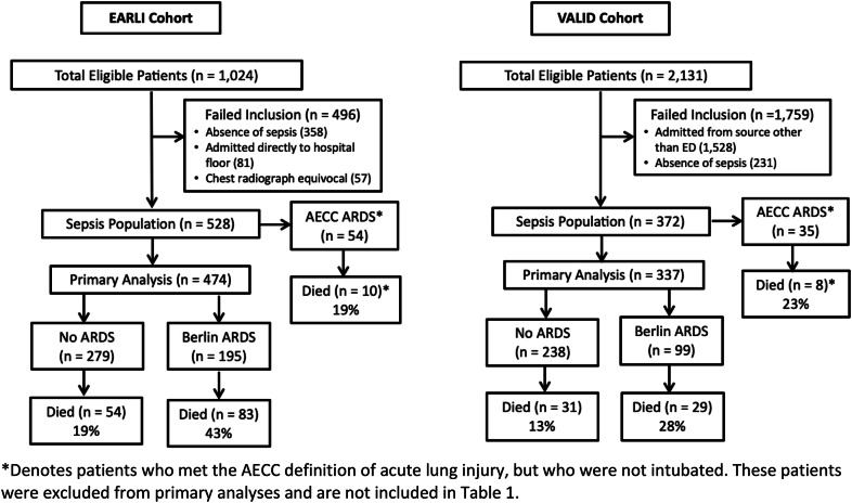 Methods: We studied two prospective sepsis cohorts drawn from the Early Assessment of Renal and Lung Injury (EARLI; n = 474) and Validating Acute Lung Injury markers for Diagnosis (VALID; n = 337) cohorts. ARDS was defined by Berlin criteria. We used logistic regression to compare in-hospital mortality in patients with and without ARDS, controlling for baseline severity of illness. We also estimated attributable mortality, adjusted for illness severity by stratification.