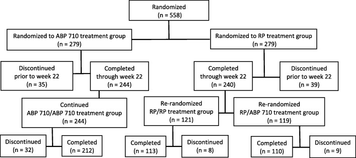 Results: A total of 558 patients were randomized for the initial treatment (ABP 710 n = 279; RP n = 279). The estimated RD of ACR20 at week 22 was 9.37% with 90% CI (2.67%, 15.96%). The lower bound was within the pre-specified criteria, thus confirming non-inferiority; the upper bound exceeded the pre-specified criteria by 0.96% such that superiority could not be ruled out statistically. In a post hoc analysis with adjustment for random imbalance in baseline factors, the CI of RD was narrowed (0.75%, 13.62%). Changes from baseline in DAS28-CRP as well as ACR20, ACR50, and ACR70 response rates across time and hybrid ACR evaluations were similar for the initial and initial/re-randomized treatment groups. Adverse events and incidence of anti-drug antibodies were similar between treatment groups.
