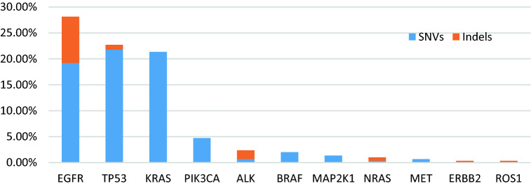 Results: 295 out of 325 patients (90.8%) had detected ctDNA results. In 62.1% (183/295) of these cases, at least one genomic alterations was detected. Frequency altered genes were EGFR (27.8%), TP53 (22.7%), KRAS (21.36%), and PIK3CA (4.75%). EGFR mutation was associated with female, younger age (< 65 years), and adenocarcinoma. The most common mutations in EGFR were L858R (39.4%), exon19 deletions (31.73%), and T790M (18.3%); G13S was the most common alterations in KRAS. TP53 mutation was most occurred in exon7 and exon8. TP53 mutation was significantly more common in patients with history of radiochemotherapy/chemotherapy therapy, and T790M was mainly found in patients with TKIs treatments. Co-existence EGFR mutation with KRAS and different multiple gene co-mutation panels were detected.