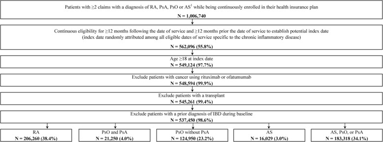Background: Chronic inflammatory diseases (CIDs; ankylosing spondylitis [AS], psoriatic arthritis [PsA], psoriasis [PsO], or rheumatoid arthritis [RA]) and inflammatory bowel disease (IBD; Crohn's disease and ulcerative colitis) are associated with substantial economic burden. The relative increased costs among patients with CIDs and concomitant IBD compared to those without IBD is an important consideration when deciding on the clinical management of patient symptoms. Given the increasing use of novel agents for the treatment of CIDs, including those that may increase the risk of IBD in patients with CIDs, the objective of the study was to describe the incidence of IBD and to quantify healthcare resource utilization (HRU) and costs associated with IBD among patients with CIDs.