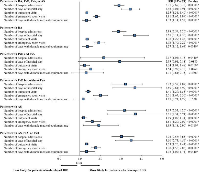 Results: A total of 537,450 patients with CIDs (mean age = 54.0 years; 63.1% female) were included in the study. The 1-year incidence rate of IBD was 0.52% (range = 0.39% in patients with PsO but without PsA to 1.73% in patients with AS). Patients who developed IBD (N = 2778) had significantly higher rates of inpatient, outpatient, and emergency room visits (incidence rate ratios [IRR] = 2.91, 1.35, 1.81; all P < 0.0001), compared to patients without IBD (N = 534,672). Patients who developed IBD had $18,500 (P < 0.0001) higher total costs per year, including $15,121 (P < 0.0001) higher medical costs and $3380 higher pharmacy costs (P < 0.0001).