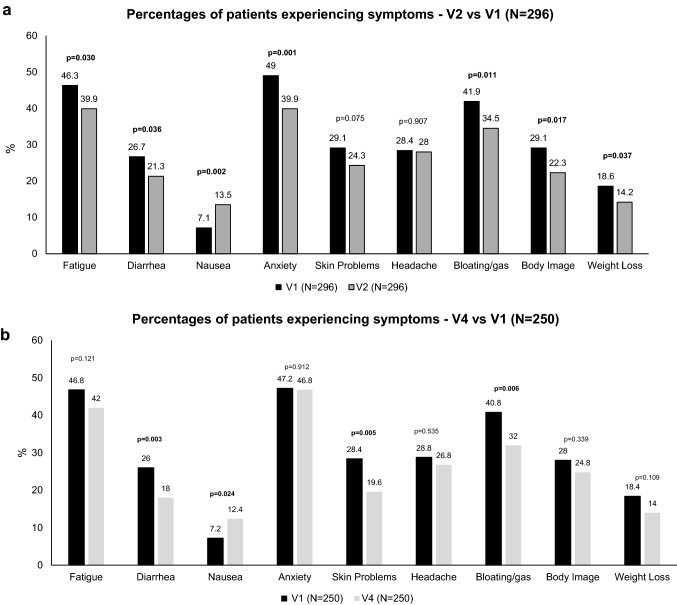 Methods: Patients entered this study between June 2016 and February 2017, once their treating physician had considered them eligible for cobicistat-boosted darunavir-based treatment as per clinical practice. Patients' satisfaction regarding regimen and current symptom burdens were assessed using two previously validated, patient-reported outcome questionnaires: HIV Treatment Satisfaction Questionnaire (HIV-TSQ) and HIV Symptoms Distress Module (HIV-SDM). These questionnaires were administered at prespecified time-points: enrollment (Visit 1), 4-8 weeks later (Visit 2), and 48 ± 6 weeks after study enrollment (Visit 4). Data of patient-reported outcome total scores for both questionnaires are presented as median with 25th-75th percentiles. Questionnaires scores were analyzed overall and stratified by gender when applicable. A p value of less than 0.05 was considered statistically significant. A sensitivity analysis was conducted to evaluate the role of lost to follow-up, using the "last observation carried forward" method.