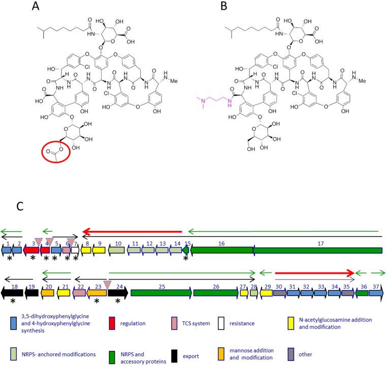 The glycopeptide A40926, produced by the actinomycete Nonomuraea gerenzanensis, is the precursor of dalbavancin, a second-generation glycopeptide antibiotic approved for clinical use in the USA and Europe in 2014 and 2015, respectively. The final product of the biosynthetic pathway is an O-acetylated form of A40926 (acA40926). Glycopeptide biosynthesis in N. gerenzanensis is dependent upon the dbv gene cluster that encodes, in addition to the two essential positive regulators Dbv3 and Dbv4, the putative members of a two-component signal transduction system, specifically the response regulator Dbv6 and the sensor kinase Dbv22. The aim of this work was to assign a role to these two genes. Our results demonstrate that deletion of dbv22 leads to an increased antibiotic production with a concomitant reduction in glycopeptide resistance. Deletion of dbv6 results in a similar phenotype, although the effects are not as strong as in the Δdbv22 mutant. Consistently, quantitative RT-PCR analysis showed that Dbv6 and Dbv22 negatively regulate the regulatory genes (dbv3 and dbv4), as well as some dbv biosynthetic genes (dbv23 and dbv24), whereas Dbv6 and Dbv22 positively regulate transcription of the single, cluster-associated resistance gene. Finally, we demonstrate that exogenously added acA40926 and its precursor A40926 can modulate transcription of dbv genes but with an opposite extent: A40926 strongly stimulates transcription of the Dbv6/Dbv22 target genes while acA40926 has a neutral or negative effect on transcription of those genes. We propose a model in which glycopeptide biosynthesis in N. gerenzanensis is modulated through a positive feedback by the biosynthetic precursor A40926 and a negative feedback by the final product acA40926. In addition to previously reported control systems, this sophisticated control loop might help the producing strain cope with the toxicity of its own product. This work, besides leading to improved glycopeptide producing strains, enlarges our knowledge on the regulation of glycopeptide biosynthesis in actinomycetes, setting N. gerenzanensis and its two-component system Dbv6-Dbv22 apart from other glycopeptide producers.
