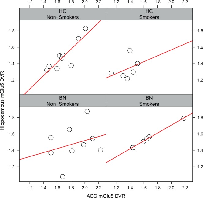 Bulimia nervosa (BN) shares central features with substance-related and addictive disorders. The metabotropic glutamate receptor subtype 5 (mGlu5) plays an important role in addiction. Based on similarities between binge eating and substance-related and addictive disorders, we investigated mGlu5 in vivo in 15 female subjects with BN and 15 matched controls. We measured mGlu5 distribution volume ratio (DVR) with positron emission tomography (PET) using [11 C]ABP688. In BN mGlu5 DVR was higher in the anterior cingulate cortex (ACC), subgenual prefrontal cortex, and straight gyrus (p < 0.05). In BN, higher mGlu5 DVR in various brain regions, including ACC, pallidum, putamen, and caudate, positively correlated with "maturity fears" as assessed using the Eating Disorder Inventory-2 (p < 0.05). In BN and controls, smokers had globally decreased mGlu5 DVR. We present the first evidence for increased mGlu5 DVR in BN. Our findings suggest that pharmacological agents inhibiting mGlu5 might have a therapeutic potential in BN.