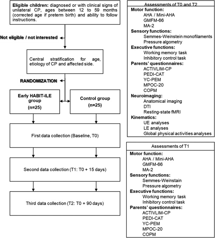 Methods: This multi-center, 3-country study will include 50 pre-school children with CP aged 1-4 years. The RCT will compare the effect of 50 h (two weeks) of HABIT-ILE versus usual motor activity, including regular rehabilitation. HABIT-ILE will be delivered in a day-camp setting, with structured activities and functional tasks that will be continuously progressed in terms of difficulty. Assessments will be performed at 3 intervals: baseline (T0), two weeks later and 3 months later. Primary outcomes will be the Assisting Hand Assessment; secondary outcomes include the Melbourne Assessment-2, executive function assessments, questionnaires ACTIVLIM-CP, Pediatric Evaluation of Disability Inventory, Young Children's Participation and Environment Measure, Measure of the Process of Care, Canadian Occupational Performance Measure, as well as neuroimaging and kinematics measures.