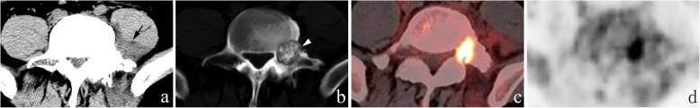 Results: Sixteen of the 21 cases were benign and 5 were aggressive OBs. Tumors were located in the lumbar (n = 11), cervical (n = 4), thoracic (n = 5), and sacral (n = 1) spinal regions. Nineteen cases were centered in the posterior elements of the spine, 13 of which extended into the vertebral body. Punctate or nodular calcifications were found in all cases on CT with a complete sclerotic rim (n = 12) or incomplete sclerotic rim (n = 8). The flare phenomenon (indicative of surrounding tissue inflammation) was found in 17/21 cases on CT, thin in 11 cases and thick in 6 cases, and in 19/19 cases on MRI, thin in 1 case and thick in 18 cases. On 18F-FDG PET/CT, all cases (8/8) were metabolically active with the SUVmax of 12.3-16.0; the flare sign was observed in 8 cases, including 7 cases of hypometabolism and 1 case of coexistence of hypermetabolism and hypometabolism. Based on CT, 3, 12, and 6 cases were classified as Enneking stage 1, 2 and 3, respectively. Of 19 cases with MRI, 1 and 18 cases were classified as Enneking stage 2 and 3, respectively.