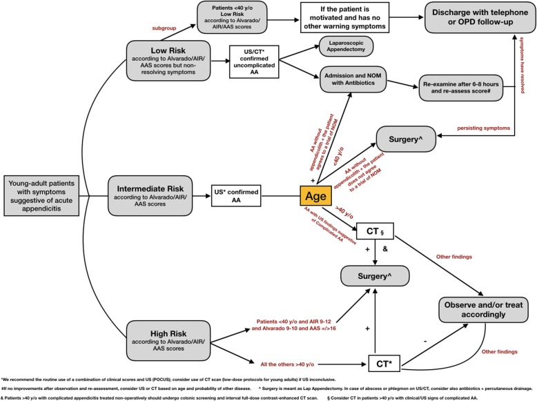 Methods: This executive manuscript summarizes the WSES guidelines for the diagnosis and treatment of AA. Literature search has been updated up to 2019 and statements and recommendations have been developed according to the GRADE methodology. The statements were voted, eventually modified, and finally approved by the participants to the consensus conference and by the board of co-authors, using a Delphi methodology for voting whenever there was controversy on a statement or a recommendation. Several tables highlighting the research topics and questions, search syntaxes, and the statements and the WSES evidence-based recommendations are provided. Finally, two different practical clinical algorithms are provided in the form of a flow chart for both adults and pediatric (< 16 years old) patients.