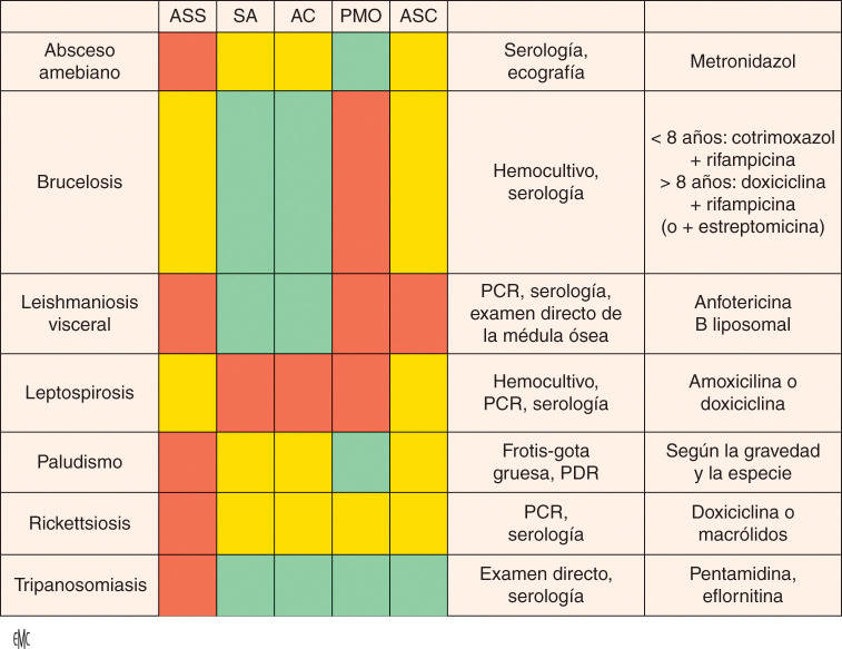 Las enfermedades más frecuentes al regresar de un viaje al extranjero son las infecciones gastrointestinales, las enfermedades febriles y los problemas dermatológicos. La evaluación de un niño febril al regreso de un viaje es clínica: verificación de los antecedentes y las vacunaciones, búsqueda de otros casos en contacto, signos funcionales y físicos, y características del viaje. Unas pruebas complementarias de rutina completan a menudo la evaluación para una orientación sindrómica. Si bien las causas de fiebre son, sobre todo, cosmopolitas, la gravedad de la enfermedad exótica obliga a buscarlas prioritariamente. El paludismo debe sospecharse ante una fiebre procedente de África subsahariana. El diagnóstico se basa en la asociación de un frotis sanguíneo y una prueba sensible (gota gruesa, reacción en cadena de la polimerasa [PCR]) o una prueba de diagnóstico rápido (para Plasmodiumfalciparum). Los criterios clínico-biológicos de gravedad son esenciales para orientar y tratar al paciente. En caso de acceso no complicado por P. falciparum, el tratamiento se basa en un tratamiento combinado a base de artemisinina (ACT), arteméter-lumefantrina o artenimol-piperaquina. Los accesos graves se tratan con artesunato intravenoso, seguido de ACT oral. Dengue, chikungunya e infección por virus Zika tienen características clínicas comunes (fiebre-erupción-artralgias, tratamiento sintomático). En caso de dengue, conviene controlar la aparición de signos de alerta, que podrían hacer temer una evolución negativa. El chikungunya es grave en caso de transmisión en el parto, con un riesgo de encefalitis neonatal. En el niño, el Zika es asintomático o poco sintomático. Pero, en caso de infección durante el embarazo, el riesgo es el de una embriofetopatía. El diagnóstico de estas arbovirosis se basa en la PCR en la fase aguda y en la serología secundariamente. La sintomatología de la fiebre tifoidea es poco específica, lo cual justifica la práctica de hemocultivos sistemáticos ante una fiebre tras un viaje. Su tratamiento se basa en las cefalosporinas de tercera generación o el ciprofloxacino, pero las resistencias aumentan. En suma, la diversidad de las etiologías de una fiebre al regreso de un viaje y la potencial gravedad de las infecciones importadas imponen una reflexión sobre el proceso de tratamiento de estos pacientes, en especial en lo referente al riesgo de fiebre hemorrágica.