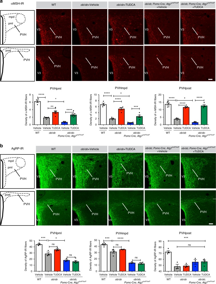 Obesity is associated with the activation of cellular responses, such as endoplasmic reticulum (ER) stress. Here, we show that leptin-deficient ob/ob mice display elevated hypothalamic ER stress as early as postnatal day 10, i.e., prior to the development of obesity in this mouse model. Neonatal treatment of ob/ob mice with the ER stress-relieving drug tauroursodeoxycholic acid (TUDCA) causes long-term amelioration of body weight, food intake, glucose homeostasis, and pro-opiomelanocortin (POMC) projections. Cells exposed to ER stress often activate autophagy. Accordingly, we report that in vitro induction of ER stress and neonatal leptin deficiency in vivo activate hypothalamic autophagy-related genes. Furthermore, genetic deletion of autophagy in pro-opiomelanocortin neurons of ob/ob mice worsens their glucose homeostasis, adiposity, hyperphagia, and POMC neuronal projections, all of which are ameliorated with neonatal TUDCA treatment. Together, our data highlight the importance of early life ER stress-autophagy pathway in influencing hypothalamic circuits and metabolic regulation.