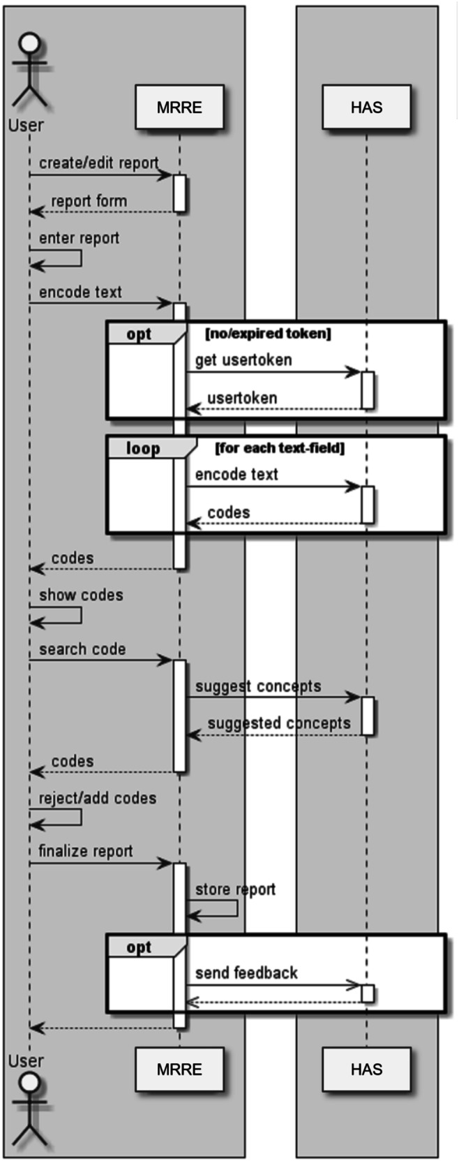 Structured reporting is a favorable and sustainable form of reporting in radiology. Among its advantages are better presentation, clearer nomenclature, and higher quality. By using MRRT-compliant templates, the content of the categorized items (e.g., select fields) can be automatically stored in a database, which allows further research and quality analytics based on established ontologies like RadLex® linked to the items. Additionally, it is relevant to provide free-text input for descriptions of findings and impressions in complex imaging studies or for the information included with the clinical referral. So far, however, this unstructured content cannot be categorized. We developed a solution to analyze and code these free-text parts of the templates in our MRRT-compliant reporting platform, using natural language processing (NLP) with RadLex® terms in addition to the already categorized items. The established hybrid reporting concept is working successfully. The NLP tool provides RadLex® codes with modifiers (affirmed, speculated, negated). Radiologists can confirm or reject codes provided by NLP before finalizing the structured report. Furthermore, users can suggest RadLex® codes from free text that is not correctly coded with NLP or can suggest to change the modifier. Analyzing free-text fields took 1.23 s on average. Hybrid reporting enables coding of free-text information in our MRRT-compliant templates and thus increases the amount of categorized data that can be stored in the database. This enhances the possibilities for further analyses, such as correlating clinical information with radiological findings or storing high-quality structured information for machine-learning approaches.