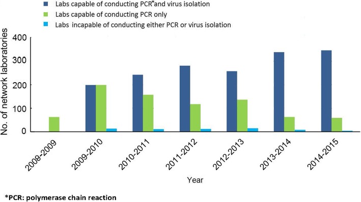 The emergence of severe acute respiratory syndrome (SARS) underscored the importance of influenza detection and response in China. From 2004, the Chinese National Influenza Center (CNIC) and the United States Centers for Disease Control and Prevention (USCDC) initiated Cooperative Agreements to build capacity in influenza surveillance in China.From 2004 to 2014, CNIC and USCDC collaborated on the following activities: 1) developing human technical expertise in virology and epidemiology in China; 2) developing a comprehensive influenza surveillance system by enhancing influenza-like illness (ILI) reporting and virological characterization; 3) strengthening analysis, utilization and dissemination of surveillance data; and 4) improving early response to influenza viruses with pandemic potential.Since 2004, CNIC expanded its national influenza surveillance and response system which, as of 2014, included 408 laboratories and 554 sentinel hospitals. With support from USCDC, more than 2500 public health staff from China received virology and epidemiology training, enabling > 98% network laboratories to establish virus isolation and/or nucleic acid detection techniques. CNIC established viral drug resistance surveillance and platforms for gene sequencing, reverse genetics, serologic detection, and vaccine strains development. CNIC also built a bioinformatics platform to strengthen data analysis and utilization, publishing weekly on-line influenza surveillance reports in English and Chinese. The surveillance system collects 200,000-400,000 specimens and tests more than 20,000 influenza viruses annually, which provides valuable information for World Health Organization (WHO) influenza vaccine strain recommendations. In 2010, CNIC became the sixth WHO Collaborating Centre for Influenza. CNIC has strengthened virus and data sharing, and has provided training and reagents for other countries to improve global capacity for influenza control and prevention.The collaboration's successes were built upon shared mission and values, emphasis on long-term capacity development and sustainability, and leadership commitment.