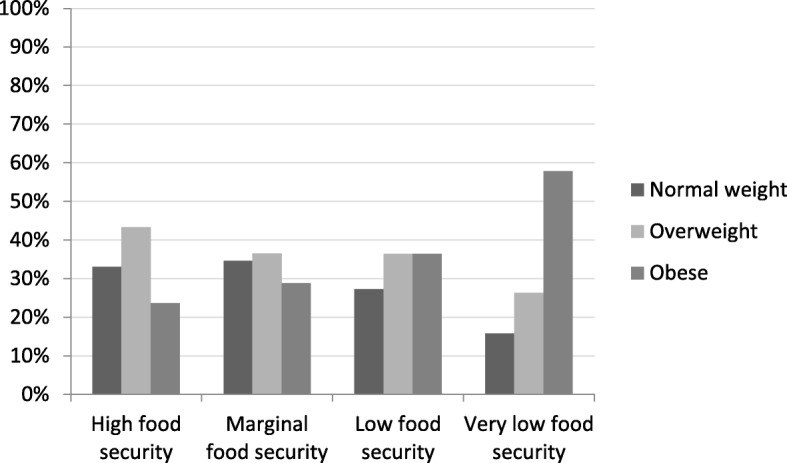 Results: The overall prevalence of food insecurity was 26%. Food insecurity was associated with obesity (OR = 2.49, 95%CI = 1.16, 5.33), but not with overweight (OR = 1.15, 95%CI = 0.54, 2.45) in the unadjusted model. The food insecurity-obesity association was partially mediated by living situation (proportion mediated: 15.4%), diet quality (- 18.6%), and smoking status (- 15.8%) after adjustment for other covariates.