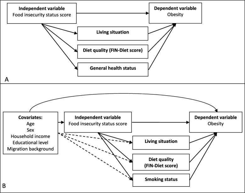 Conclusions: The findings of this study suggest an association between food insecurity and obesity. Living situation, diet quality and smoking status explained part, but not all, of the total association between food insecurity and obesity. Future longitudinal studies are warranted to examine the temporal order of the food insecurity-obesity association and potential mediators in this relationship. In addition, food insecurity and its potential consequences need to be taken into account in obesity prevention programs and policies.