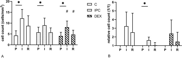 Small intestinal strangulation associated with ischaemia-reperfusion injury (IRI) is common in horses. In laboratory animals IRI can be ameliorated by ischaemic preconditioning (IPC) and pharmacological preconditioning (PPC) with dexmedetomidine. The aim of this study was to determine the effect of PPC with dexmedetomidine or IPC in an equine model of small intestinal ischaemia-reperfusion (IR). In a randomized controlled experimental trial, 15 horses were assigned to three groups: control (C), IPC, and PPC with dexmedetomidine (DEX). All horses were placed under general anaesthesia and 90% jejunal ischaemia was induced for 90 minutes, followed 30 minutes of reperfusion. In group IPC, three short bouts of ischaemia and reperfusion were implemented, and group DEX received a continuous rate infusion of dexmedetomidine prior to the main ischaemia. Jejunal biopsies were collected before ischaemia (P), and at the end of ischaemia (I) and reperfusion (R). Mucosal injury was assessed by the Chiu-Score, inflammatory cells were stained by cytosolic calprotectin. The degree of apoptosis and cell necrosis was assessed by cleaved-caspase-3 and TUNEL. Parametric data were analyzed by two-way ANOVA for repeated measurements followed by Dunnetts t-test. Non parametric data were compared between groups at the different time points by a Kruskal-Wallis-Test and a Wilcoxon-2-Sample-test. The mucosal injury score increased during I in all groups. After reperfusion, IRI further progressed in group C, but not in IPC and DEX. In all groups the number of cleaved caspase-3 and TUNEL positive cells increased from P to I. The number of TUNEL positive cells were lower in group DEX compared to group C after I and R. Infiltration with calprotectin positive cells was less pronounced in group DEX compared to group C, whereas in group IPC more calprotectin positive cells were seen. In conclusion, IPC and DEX exert protective effects in experimental small intestinal ischaemia in horses.