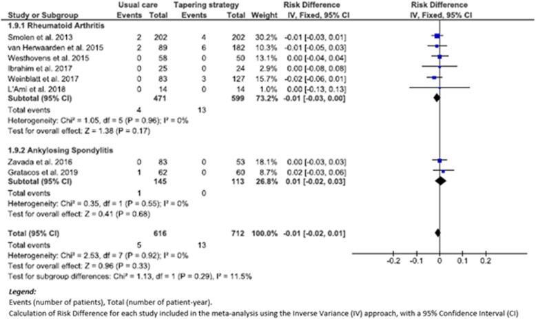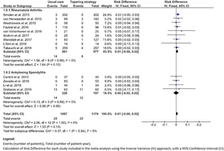 Results: Of the 1957 studies initially identified, 13 controlled trials (9 RA and 4 SpA trials) were included in the meta-analysis. 1174 patient-years were studied in the tapering group (TG) versus 1086 in the usual care group (UC). There were 1.7/100 patient-year (p-y) serious infections in TG versus 2.6/100 p-y in UC (RD (95% CI) 0.01 (0.00 to 0.02), p = 0.13) and 7.4/100 p-y SAEs in TG versus 6.7/100 p-y in UC (RD 0.00 (- 0.02 to 0.02), p = 0.82). The risk of malignancies, CV AEs, or deaths did not differ between the tapering and the usual care groups. Subgroup analysis (RA and SpA) detected no significant differences between the two groups.