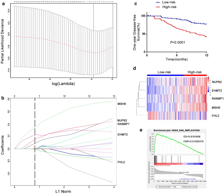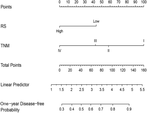 Results: In the training cohort, we identified a RS model consisting of five stage-related genes (NUP62, EHMT2, RANBP1, MSH6 and FHL2) for recurrence at 1 year. The 1-year disease-free survival of patients was worse in the high-risk group than in the low-risk group (P < 0.0001), and 1-year recurrence was more likely in the high-risk group (Hazard ratio: 3.199, P < 0.001). The AUC of the nomogram was 0.739, 0.718 and 0.693 in the training, testing and external validation cohort, respectively, and these values were larger than the corresponding AUC of the TNM stage (0.681, 0.688 and 0.616, respectively).