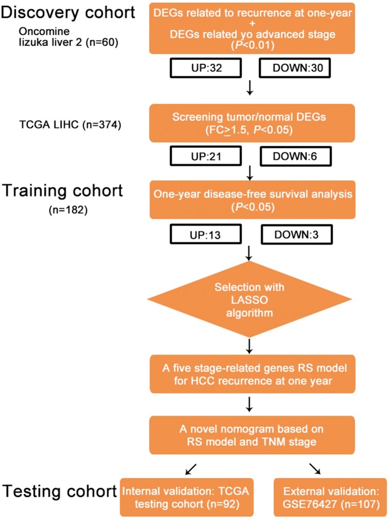 Conclusions: A RS model consisting of five stage-related genes was successfully identified for predicting 1-year HCC recurrence. Then, a novel nomogram based on the RS model and TNM stage to predict 1-year HCC recurrence was also developed and validated.
