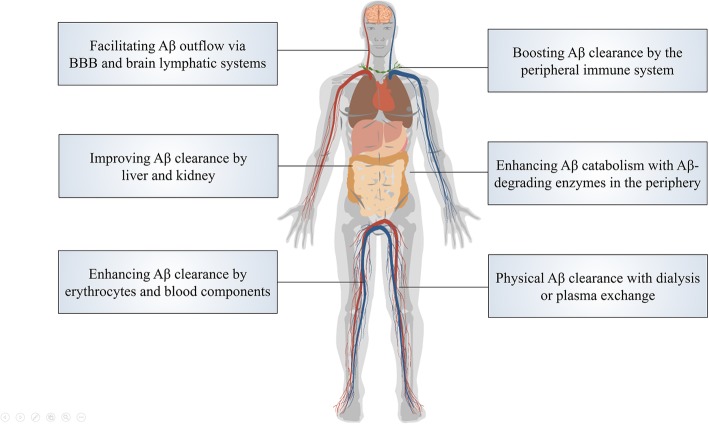 Keywords: Alzheimer’s disease; Beta-amyloid (Aβ); Blood; Blood-brain barrier; Enzymes; Intestine; Kidney; Liver; Lymphatic vessel; Monocyte; Periphery; Skin; Venous sinus.