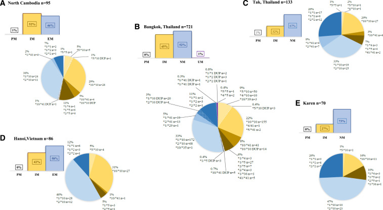 Clinical failure of primaquine (PQ) has been demonstrated in people with CYP450 2D6 genetic polymorphisms that result in reduced or no enzyme activity. The distribution of CYP2D6 genotypes and predicted phenotypes in the Cambodian population is not well described. Surveys in other Asian countries have shown an approximate 50% prevalence of the reduced activity CYP2D6 allele *10, which could translate into increased risk of PQ radical cure failure and repeated relapses, making interruption of transmission and malaria elimination difficult to achieve. We determined CYP2D6 genotypes from 96 volunteers from Oddor Meanchey Province, Cambodia, an area endemic for Plasmodium vivax. We found a 54.2% frequency of the *10 allele, but in approximately half of our subjects, it was paired with a normal activity allele, either *1 or *2. The prevalence of *5, a null allele, was 9.4%. Overall predicted phenotype percentages were normal metabolizers, 46%; intermediate metabolizers, 52%; and poor metabolizers, 1%.