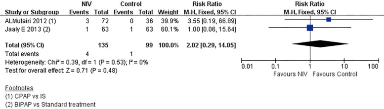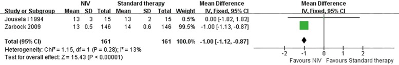 Results: We included nine randomized controlled trails with 830 subjects. The use of NIV failed to reduce the risk of pulmonary complications, including atelectasis [risk rate (RR) 0.60; 95% confidence interval (CI): 0.28 to 1.28, P=0.19] and pneumonia (RR 0.27; 95% CI: 0.05 to 1.64, P=0.16). However, it has shortened the length of ICU stay (MD -1.00 h, 95% CI: -1.38 to -0.63, P<0.00001) and the length of hospital stay (MD -1.00 d, 95% CI: -1.12 to -0.87, P<0.00001). NIV also failed to reduce the rate of reintubation (RR 0.68; 95% CI: 0.21 to 2.26, P=0.53) or the risk of cardiac complications (RR 0.81; 95% CI: 0.59 to 1.13, P=0.22).