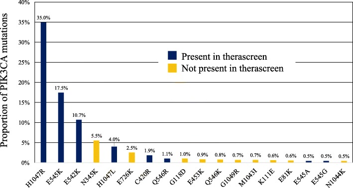 Conclusion: PIK3CA mutations in BC are heterogenous and ~ 20% of patients with a known PIK3CA mutation, and 95% with a known double PIK3CAmut tumor, would not be captured by the therascreen panel. Finally, the clinical utility of PIK3CA mutations not present in the therascreen companion diagnostic assay or identified by other sequencing-based assays needs further investigation.