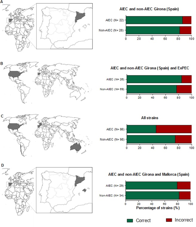 Adherent-invasive Escherichia coli (AIEC) have been extensively implicated in Crohn's disease pathogenesis. Currently, AIEC is identified phenotypically, since no molecular marker specific for AIEC exists. An algorithm based on single nucleotide polymorphisms was previously presented as a potential molecular tool to classify AIEC/non-AIEC, with 84% accuracy on a collection of 50 strains isolated in Girona (Spain). Herein, our aim was to determine the accuracy of the tool using AIEC/non-AIEC isolates from different geographical origins and extraintestinal pathogenic E. coli (ExPEC) strains. The accuracy of the tool was significantly reduced (61%) when external AIEC/non-AIEC strains from France, Chile, Mallorca (Spain) and Australia (82 AIEC, 57 non-AIEC and 45 ExPEC strains in total) were included. However, the inclusion of only the ExPEC strains showed that the tool was fairly accurate at differentiating these two close pathotypes (84.6% sensitivity; 79% accuracy). Moreover, the accuracy was still high (81%) for those AIEC/non-AIEC strains isolated from Girona and Mallorca (N = 63); two collections obtained from independent studies but geographically close. Our findings indicate that the presented tool is not universal since it would be only applicable for strains from similar geographic origin and demonstrates the need to include strains from different origins to validate such tools.