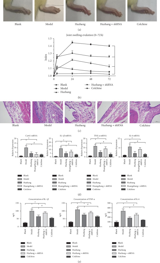 Methods: Huzhang Tongfeng granule was provided by the pharmaceutical preparation room of Yueyang Hospital of Integrated Traditional Chinese and Western Medicine. The expressions of Cyr61, IL-1β, TNF-α, and IL-6 in monosodium urate- (MSU-) induced rat models and fibroblast-like synoviocytes (FLSs) were determined by RT-PCR, Western blotting analysis, ELISA, immunohistochemistry, and hematoxylin and eosin staining.