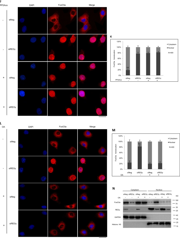 Pathological cardiac hypertrophy eventually leads to heart failure without adequate treatment. REGγ is emerging as 11S proteasome activator of 20S proteasome to promote the degradation of cellular proteins in a ubiquitin- and ATP-independent manner. Here, we found that REGγ was significantly upregulated in the transverse aortic constriction (TAC)-induced hypertrophic hearts and angiotensin II (Ang II)-treated cardiomyocytes. REGγ deficiency ameliorated pressure overload-induced cardiac hypertrophy were associated with inhibition of cardiac reactive oxygen species (ROS) accumulation and suppression of protein phosphatase 2A catalytic subunit α (PP2Acα) decay. Mechanistically, REGγ interacted with and targeted PP2Acα for degradation directly, thereby leading to increase of phosphorylation levels and nuclear export of Forkhead box protein O (FoxO) 3a and subsequent of SOD2 decline, ROS accumulation, and cardiac hypertrophy. Introducing exogenous PP2Acα or SOD2 to human cardiomyocytes significantly rescued the REGγ-mediated ROS accumulation of Ang II stimulation in vitro. Furthermore, treatment with superoxide dismutase mimetic, MnTBAP prevented cardiac ROS production and hypertrophy features that REGγ caused in vivo, thereby establishing a REGγ-PP2Acα-FoxO3a-SOD2 pathway in cardiac oxidative stress and hypertrophy, indicates modulating the REGγ-proteasome activity may be a potential therapeutic approach in cardiac hypertrophy-associated disorders.